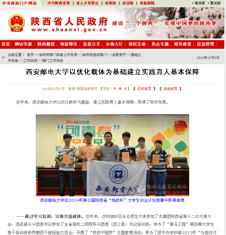 ——重视科技竞赛活动,提升既有载体。以挑战杯为龙头的大学生科技竞赛活动,是该校实践育人工作的重要内容之一。近年来,该校加大对“挑战杯”等科技活动的支持力度,加强管理队伍、指导教师队伍、参赛学生队伍建设,涌现出一批优秀指导老师,实现了学生科研团队“传帮带”的有效运行,“挑战杯”成绩逐年提高。2013年第十三届“挑战杯”全国大学生课外学术科技作品竞赛,该校成绩再次实现历史性突破,获奖数量在全省高校中名列前茅,奖项含金量也大幅提高。获得“哲学社会科学类社会调查报告和学术论文”类全国二等奖1项,三等奖1项,实现了该校社科类作品获奖层次的新突破,并且该校二等奖获奖作品由全国评委会专家推荐作为陕西省唯一一件作品参加全国“公开答辩”环节;获得“科技发明制作”类全国三等奖两项,并获得“累进创新奖”银奖一项。2014年第七届陕西省“挑战杯”大学生创业计划竞赛中,该校共有25件作品入围决赛,15件作品获奖,其中银奖5项,铜奖10项,并捧得“优胜杯”,获奖数量创新高。