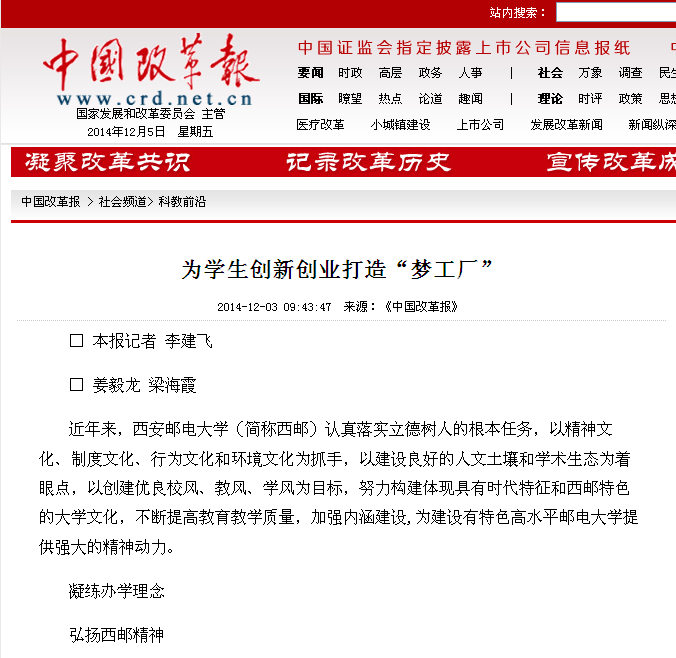 2014年12月3日《中国改革报》第四版报道Beat365为学生创新创业打造“梦工厂” 。