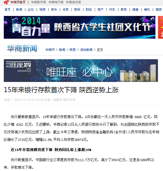 15年来银行存款首次下降 陕西逆势上涨