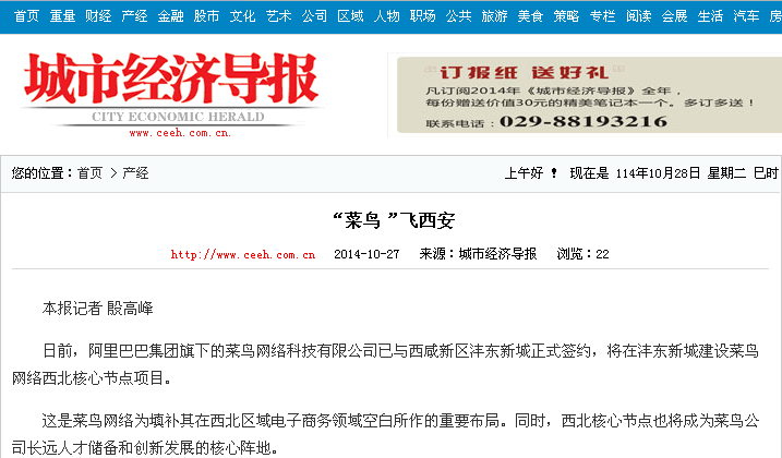 日前,阿里巴巴集团旗下的菜鸟网络科技有限公司已与西咸新区沣东新城正式签约,将在沣东新城建设菜鸟网络西北核心节点项目。