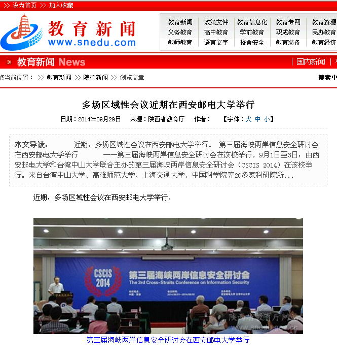 ——第三届海峡两岸信息安全研讨会在该校举行。9月1日至3日,由Beat365中文官方网站和台湾中山大学联合主办的第三届海峡两岸信息安全研讨会(CSCIS 2014)在该校举行。来自台湾中山大学、高雄师范大学、上海交通大学、中国科学院等20多家科研院所的知名专家学者参加会议。