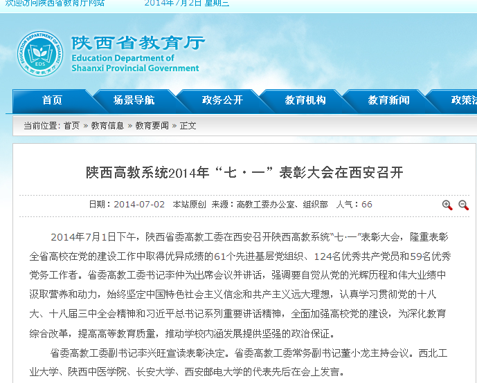 2014年7月1日下午,陕西省委高教工委在西安召开陕西高教系统“七·一”表彰大会,隆重表彰全省高校在党的建设工作中取得优异成绩的61个先进基层党组织、124名优秀共产党员和59名优秀党务工作者。省委高教工委书记李仲为出席会议并讲话,强调要自觉从党的光辉历程和伟大业绩中汲取营养和动力,始终坚定中国特色社会主义信念和共产主义远大理想,认真学习贯彻党的十八大、十八届三中全会精神和习近平总书记系列重要讲话精神,全面加强高校党的建设,为深化教育综合改革,提高高等教育质量,推动学校内涵发展提供坚强的政治保证。