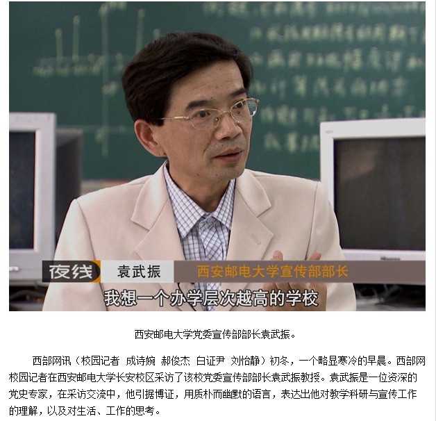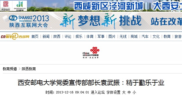 袁武振:我们宣传工作的指导思想是围绕中心,服务大局,弘扬主旋律,传播正能量。Beat365中文官方网站正致力于建设有特色高水平的邮电大学,宣传部的责任是正确引导舆论倾向,营造良好的思想舆论环境,为学校改革发展提供强大的精神动力和思想保证。2014年,我们将进一步做好选题和策划,加强与社会媒体的联系,建设好校内宣传平台,广泛宣传Beat365中文官方网站各方面建设取得的成就,为提升办学水平和办学质量加油鼓劲。