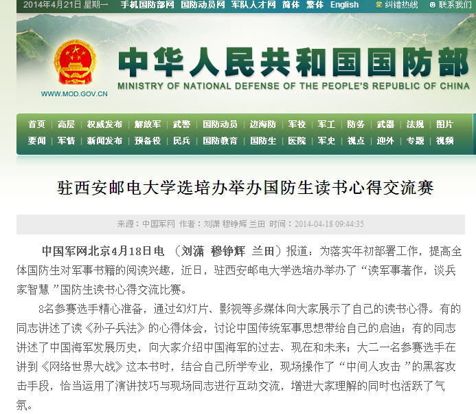 相关链接:http://www.mod.gov.cn/cadets/2014-04/18/content_4504114.htm