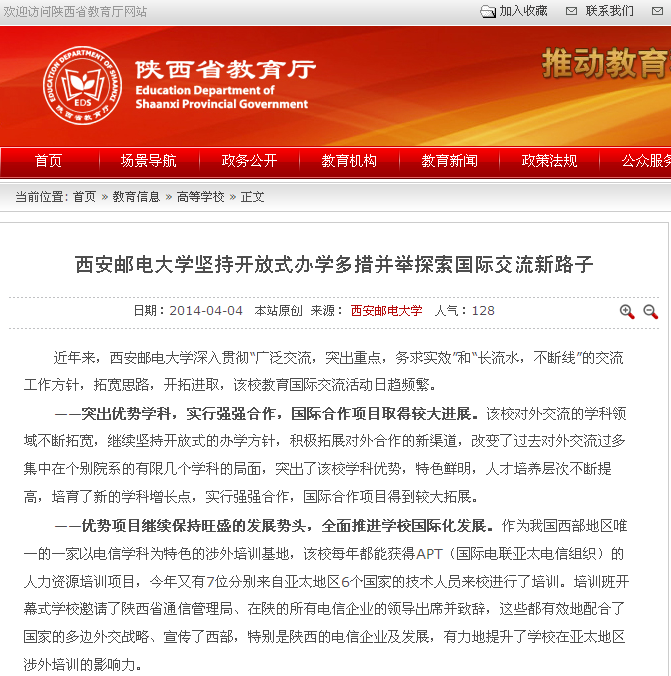 作为我国西部地区唯一的一家以电信学科为特色的涉外培训基地,该校每年都能获得APT(国际电联亚太电信组织)的人力资源培训项目,今年又有7位分别来自亚太地区6个国家的技术人员来校进行了培训。培训班开幕式学校邀请了陕西省通信管理局、在陕的所有电信企业的领导出席并致辞,这些都有效地配合了国家的多边外交战略、宣传了西部,特别是陕西的电信企业及发展,有力地提升了学校在亚太地区涉外培训的影响力。