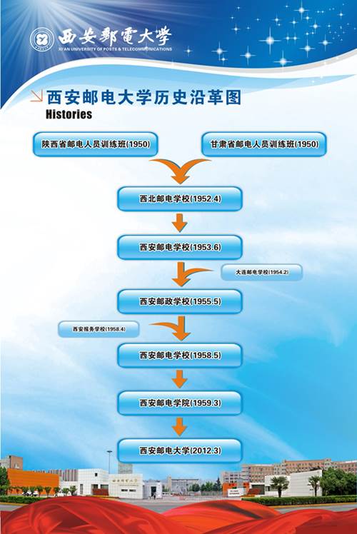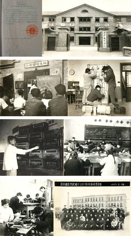 1950年初,国家进入全面经济恢复时期,为了迅速发展人民邮电事业,急需培养邮电业务管理和技术人才,西北邮电管理局创办了陕西省邮电人员训练班和甘肃省邮电人员训练班。1952年4月1日,西北邮电管理局决定,将陕西、甘肃两省邮电人员训练班合并,正式成立西北邮电学校。1953年6月1日,邮电部将西北邮电学校改名为西安邮电学校。1955年5月1日,邮电部将西安邮电学校改名为西安邮政学校,正式列入国家中专学校系列,并抽调干部组建西安报务学校。1958年5月1日,邮电部决定撤销西安报务学校,并入西安邮政学校,增设电信专业,将校名改为西安邮电学校。1953年到1958年,西邮得到了很大的发展,成为一所以邮电管理为主,兼容电信技术专业的邮电中专,为西北邮电企业输送了大量人才。学校加强实践教学,接办了小寨邮电局、临潼邮电局作为实习基地,取得了良好的效果。